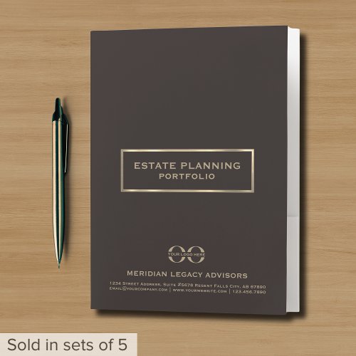 Elevate your organizational game with our Blue and Gold Business Presentation Folder. Featuring a brushed gold monogram initial paired with your company name and information, this folder exudes a sense of professionalism and style. The design is showcased against a sophisticated blue leather print background, making it a perfect accessory for estate planners, attorneys, and advisors looking to make a lasting impression. Keep your important documents, presentations, and materials organized in one place, while showcasing your brand's elegance and attention to detail. Make a lasting impression with this luxurious folder that combines functionality and visual appeal seamlessly.