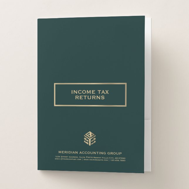 A must-have for tax professionals, these pocket folders feature a rich emerald green background, window design framed in gold with customizable text and a gold geometric logo, perfect for organizing income tax returns and client presentation materials. Bulk orders are available with no minimum. Bulk discounts are available; see details here: https://www.zazzle.com/business/bulk.