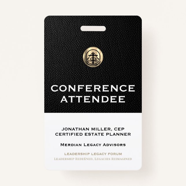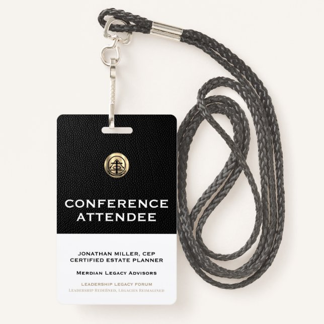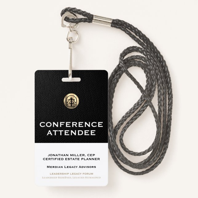 Elevate your conference experience with our Customizable Conference Badge Lanyard. This premium lanyard features a brushed gold seal logo at the top, followed by "Conference Attendee" or your preferred role in classic white typography on a stylish black background. The bottom section offers ample white space for the attendee's name, title, and company or personalized text. In the lower thirds, the conference name and tagline are elegantly displayed. Ensure easy identification, networking, and a professional touch at your event with this versatile and stylish lanyard.