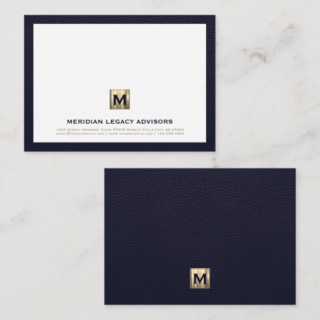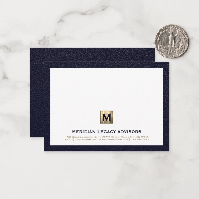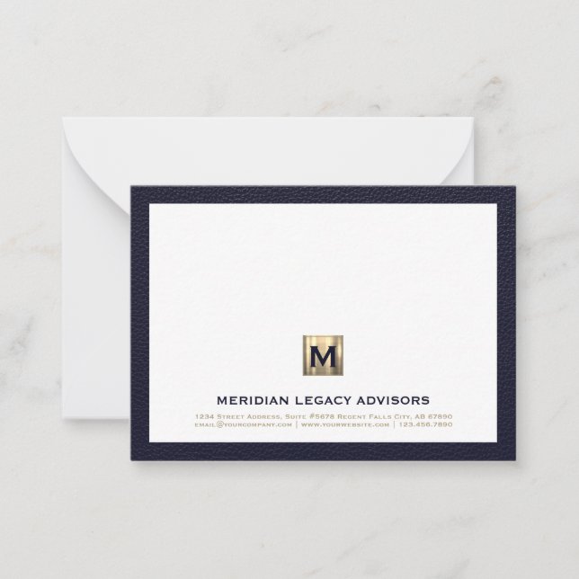 Send your messages with a touch of sophistication using our Luxe Navy Gold Law Firm Note Card. The front showcases a brushed gold monogram initial logo elegantly placed in the lower thirds, accompanied by your company name and details in classic navy blue typography, all framed in a subtle blue textured print. This design exudes professionalism and style, making it perfect for attorneys, estate planners, and business professionals seeking to leave a lasting impression. The back of the note card features the monogram emblem in the lower thirds on the rich navy blue print background, ensuring a consistent and distinguished look. Elevate your communications with this blend of refined design and practicality.