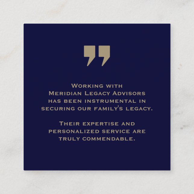 Leave a lasting impression with our Professional Navy Blue and Gold Business Card. The front of this card boasts a sleek and solid navy blue background with your company logo, name, title and essential contact information elegantly showcased in classic typography. On the back, showcase a client testimonial with golden quotation marks, making it a powerful tool for networking and representing your brand. Ideal for estate planners, attorneys, advisors, and business professionals.