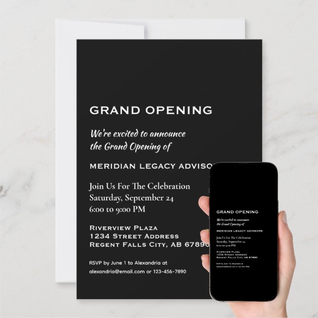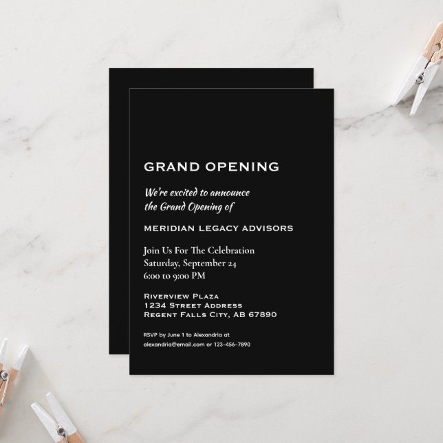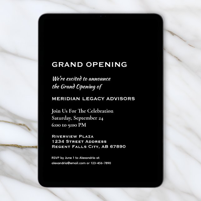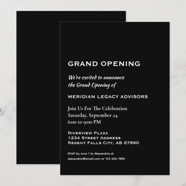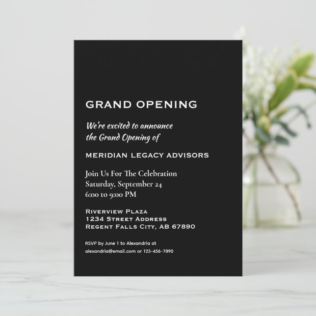 Elevate your grand opening celebration with our Simple Minimalist Grand Opening Invitation. This invitation sets the perfect tone for your company's big day, featuring a simple modern minimalist design with classic typography on a sleek black background. Personalize with your company name, event details, and RSVP information to create a memorable and sophisticated invitation. Make a lasting impression with this timeless design.